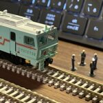 曲線はフレキシブルレールであえてきつい半径にし、長いストレートを優先しました。20両編成までは一直線に並ぶように作っています。デスク手前側に緩い曲線を作ることで、わずかなリアリティを楽しんでいます。見る場所や角度によっては複々線や平行する別線に見えるのは思わぬ副産物でした。